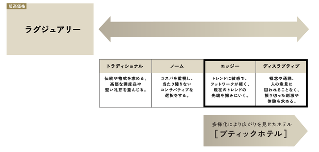 消費の多様化とともに旅や宿泊スタイルの多様化が進み、世界のホテル市場は変化しています。従来は高価格なホテルがラグジュアリーとされていましたが、現在は価格帯ではなく、顧客のライフスタイルや価値観を軸に広く多様化が進んでいます。ラグジュアリー領域は「トラディショナル」「ノーム」「エッジー」「ディスラプティブ」という大きく4つのカテゴリーに定義でき、トレンドの先端にいる、振り切った刺激や体験を追い求める顧客層に向けて海外で増加しているのが、ブティックホテル※です。