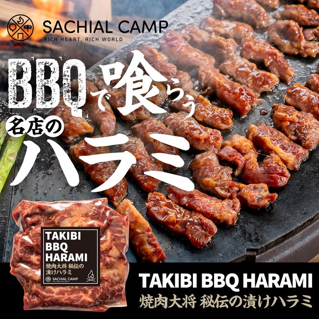 キャンプ飯専門のオンラインショップ『SACHIALCAMP』(サチアルキャンプ)より、名店の味を再現したBBQで喰らうための漬けハラミ「TAKIBI BBQ ハラミ」が新登場!期間限定のデビューキャンペーンを開催中!