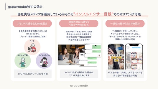 株式会社gracemode(本社:東京都目黒区、代表取締役:福家みのり)は、SNS美容メディア「EMME(@emme_tokyo.jp)」の運営を通じて培ってきたインフルエンサーとの関係値・PRノウハウを活かし、美容ブランドに特化したSNSプロモーション支援サービス「PR支援プラン」の提供を開始しました。