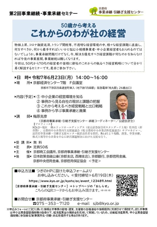京都府事業承継・引継ぎ支援センターでは、令和7年度第2回事業継続・事業承継セミナーとして、標記セミナーを開催いたします。
