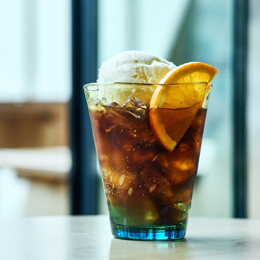 コールド ブリュー コーヒーにフレッシュオレンジ、バニラアイスクリームをトッピングした一品。この器のふるさと・沖縄の夏の風物詩であり、金時豆とかき氷を一緒に楽しむ「ぜんざい」からヒントを得て、クラッシュアイスをたっぷり注ぎました。アイスクリームが溶け乳白色に変わることで、徐々に琉球グラスの繊細な気泡と鮮やかな青い色彩が姿を現します。青いガラスとスライスオレンジの橙の組み合わせは、沖縄の真っ青な海から上る力強い朝陽に重なります。