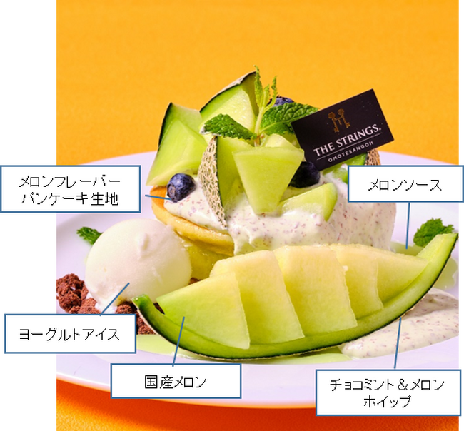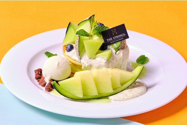 香り高い国産のフレッシュなメロンを、パンケーキの間とトップ、サイドにも添えたメロン尽くしの一皿です。