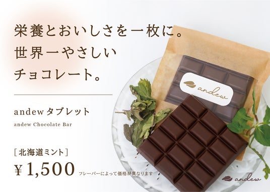 andewは、チョコレートの原料のカカオ豆に加え、アーモンド、きな粉、チアシード、ココナツ、ケシの実、抹茶、 昆布などの栄養たっぷりの食材をふんだんに使用し、栄養価を最大まで高めた世界初の完全食チョコレート。