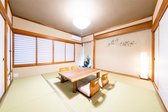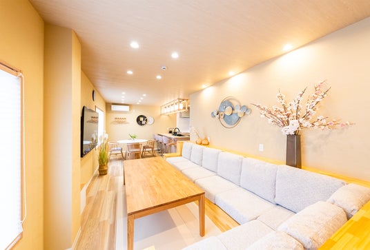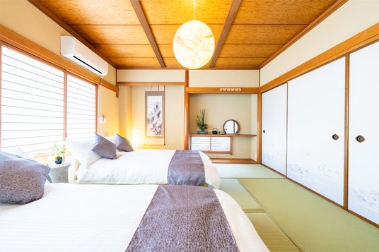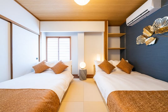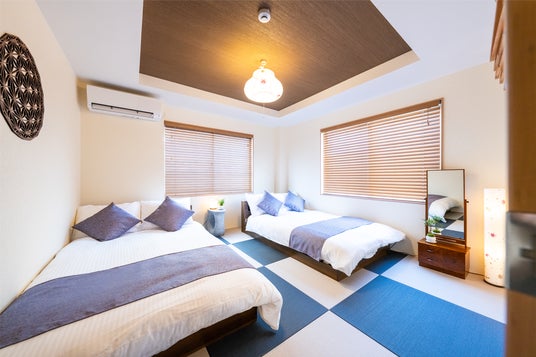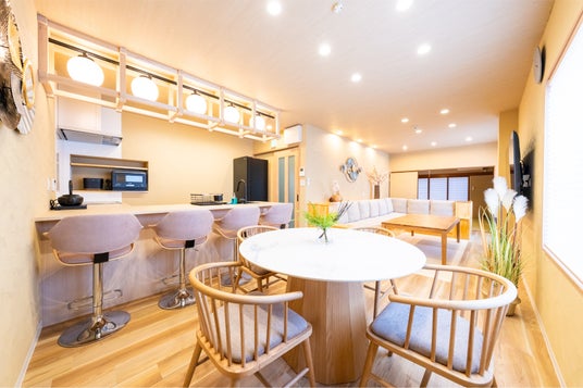 物件は全5LDK。各部屋は落ち着いた和モダンテイストで統一され、ゆったりとした広さのリビングダイニングに、和室のくつろぎ空間も備わっています。セミダブルベッドや布団を組み合わせることで、複数世帯や大人数のグループにも柔軟に対応できます。