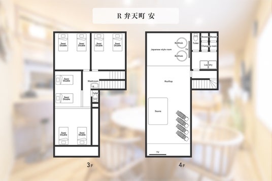 基本設備:TV付きルーフトップサウナ、セミダブルベッド×10台、シングルベット1台、2段ベットあり、シングルサイズの布団3枚、バスルーム3、トイレ3、洗面所3、冷蔵庫、電子レンジ、炊飯器、調理器具一式、ドラム式洗濯機、エアコン、ドライヤー、無料Wi-Fi、専用駐車場2台分、無料レンタル自転車2台 など