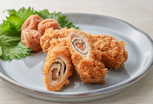 「紀州産梅と大葉の巻きかつ」は、紀州産の梅肉と大葉を薄切りの豚ロース肉で巻いたかつです。梅の酸味と大葉の香味で暑い日でもさっぱり食べられると毎年ご好評いただいています。梅と大葉の香りが爽やかな、夏にこそ楽しみたい揚げ物です。晩ごはんのおかずに、ビールやハイボールのおともにぜひお試しください。