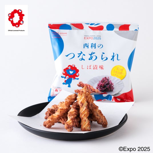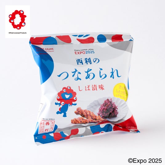 綱のようにねじれた形状のあられと、西利のしば漬が一緒になり、サクサク食感と酸味、塩味のバランスが絶妙にマッチした味わいです。子どもから大人まで楽しめる仕上がりで、おやつやお酒のお供にもおすすめです。パッケージは大阪・関西万博公式キャラクター「ミャクミャク」が大きくデザインされており、お土産にも最適。