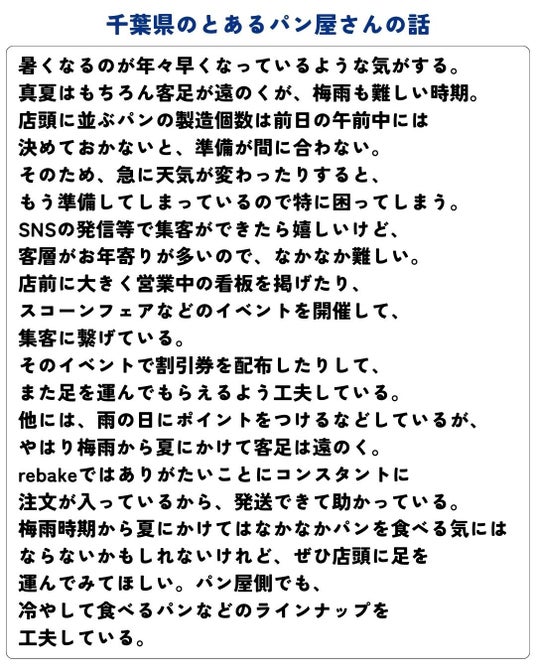 ロスパン販売プラットフォームrebakeは、パン屋さんが梅雨時期もロスパンの負担を恐れずに営業できるよう、ロスパンの販促や消費者の理解を深める取り組みを行なっています。・ロスパンの教科書