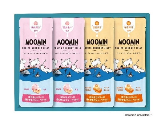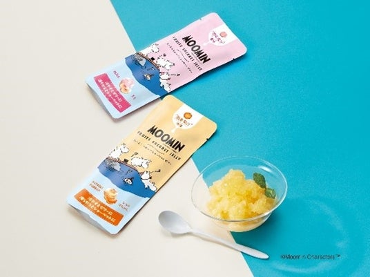 国産果汁を使用したシャーベットゼリーで、常温時はゼリーとして、凍らせるとシャーベットとして、二通りの食べ方を楽しむことができます。パッケージは夏らしく、水辺で遊ぶムーミンのイラストに、夏らしい爽やかなカラーリングのデザインを施しました。