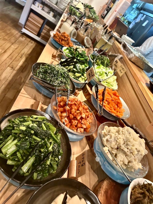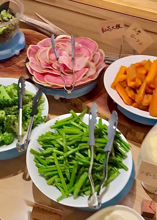 福岡市博多区の「FarmersRestaurant(ファーマーズレストラン)はなや」では、新鮮野菜のファーマーズビュッフェが人気です。彩り鮮やかなサラダ・お惣菜を盛り付けた料理皿が長いカウンターにずらりと並び、メイン料理とのセットでもビュッフェだけでも注文できます。