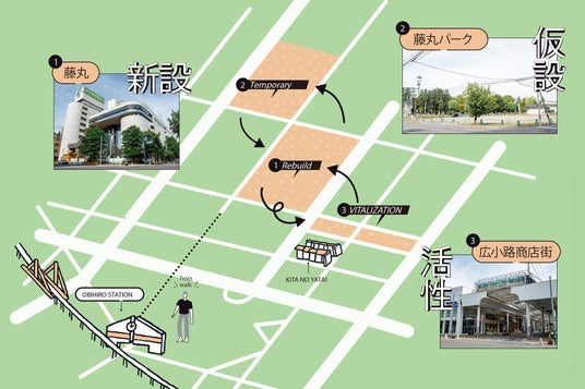 「(仮称)新藤丸」は2030年を目標に藤丸百貨店跡地での新設が予定されています。完成まで機運を醸成し続けるとともに、地域一体の活性化を目指して、周遊促進に向けた各種施策が展開されます。その一環として、近隣の遊休地には仮設商業施設「藤丸パーク」が開設されるほか、地元「広小路商店街」と連動した施策など、地域を巻き込んだ取り組みが計画されています。