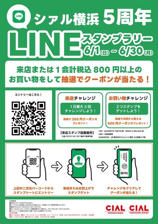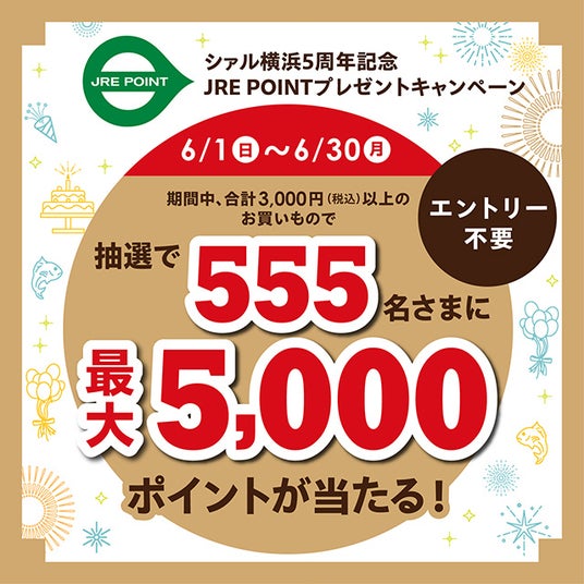 また、5周年記念特別企画として「LINEスタンプラリーキャンペーン」「JRE POINTプレゼントキャンペーン」等イベントも盛りだくさん!ぜひこの機会にシァル横浜でのお買い物・お食事をお楽しみください。