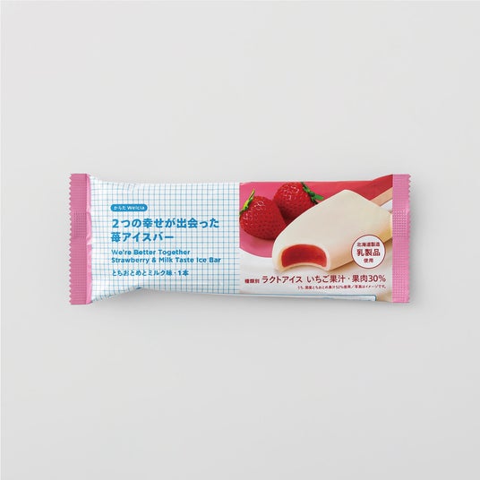 国産とちおとめ果汁を52%使用した苺アイスと北海道産乳製品を使用した、ミルクアイスと2層構造の贅沢な苺アイスバー