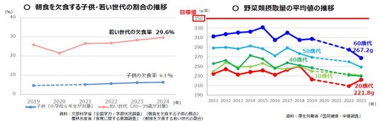 現在、日本では若い世代の朝食欠食率が29.6%に達し、年々増加傾向にあります。また、一日当たりの野菜類摂取量も20歳代では221.8gと、成人の摂取目標量である350gを大きく下回っています。こうした食生活の乱れは、健康面だけでなく、将来的には食文化の継承や農業などの生産現場への理解にも影響を及ぼすことが懸念されます。