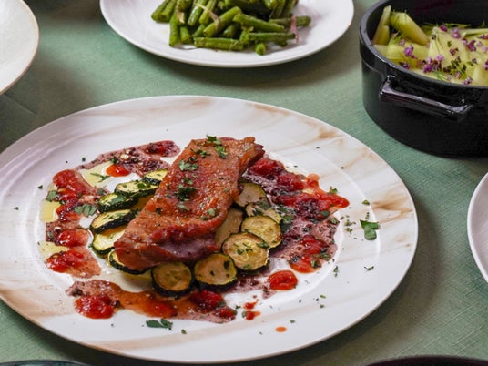 奈良漬けの酒粕でじっくりとマリネしたローストビーフは、まろやかな香りとほのかな甘みが肉にしっかり染み込み、驚くほどジューシー。しっとりとした肉質を引き立てるコク深い赤ワイン味噌ソースを添えてお召しあがりください。