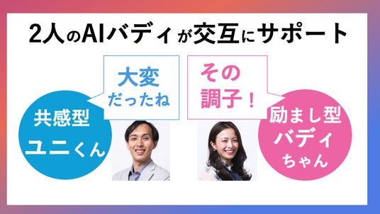 Givin' Backの2名がモデルとなったAIバディが交互にユーザーに声がけを実施。