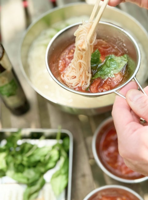 常温で持ち運べるそうめんは、キャンプの必須アイテム。新鮮なトマトを使って、シンプルが贅沢な初夏らしい味わいに。