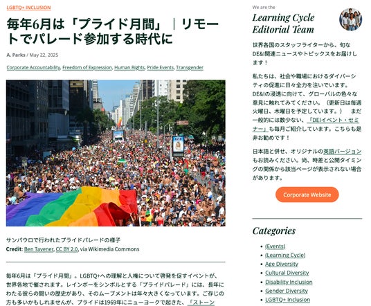 ラーニングサイクルは「DEI(ダイバーシティ・エクイティ・インクルージョン)」に関する取り組みを国内外で取材・発信しており、今回の協賛を機に、世界のプライドパレードの最新動向を紹介する記事を公開し、啓発活動に力を注いでいきます。