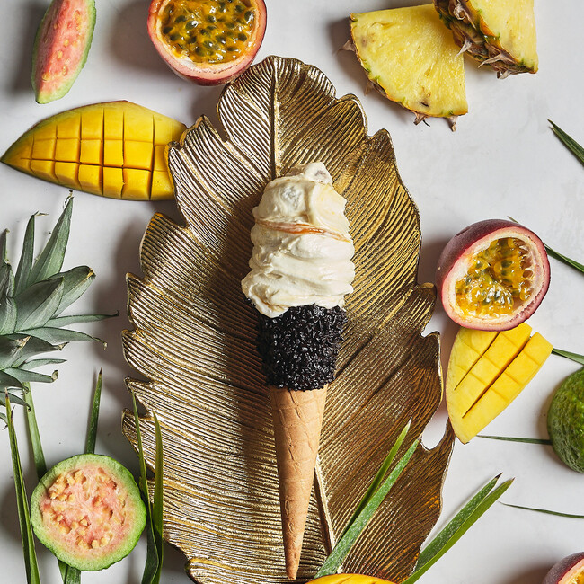 「サマータイム」は新鮮なミルクのジェラートをベースに、グアバ、パッションフルーツ、パイナップル、マンゴーをブレンドしたトロピカルなフレーバー。ジューシーなグアバの甘み、パッションフルーツとパイナップルの鮮やかな酸味、マンゴーのなめらかでクリーミーなコクが、味覚を楽園へといざないます。