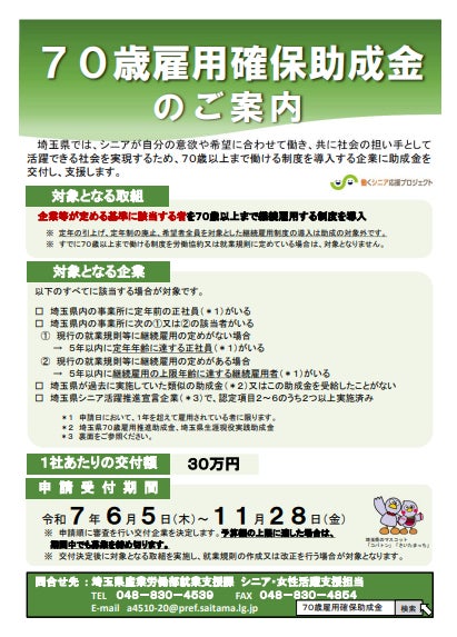 *埼玉県70歳雇用推進助成金、埼玉県生涯現役実践助成金