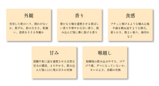 本グランプリでは、機械審査は一切行わず、予選から全て土鍋で炊いたお米を実際に食し、すべて官能審査にてお米を評価します。審査は下記5項目に加え、審査員毎に「玄米の扱いやすさ」「トータルバランス」など加点項目を設定し、評価します。