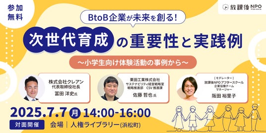 「日本中の放課後を、ゴールデンタイムに。」をビジョンに活動する特定非営利活動法人 放課後NPOアフタースクール(代表理事:平岩国泰/本部:東京都文京区/以下、放課後NPOアフタースクール)は7月7日(月)、人権ライブラリー(東京都港区芝大門2-10-12 KDX芝大門ビル4F)にて「BtoB企業が未来を創る!次世代育成の重要性と実践例 ~小学生向け体験活動の事例から~」を開催します。
