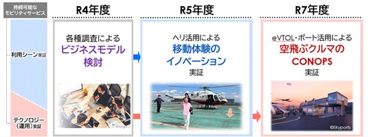 海外で空飛ぶクルマの離着陸場の設置・運用事業を展開する英Skyports社の協力によりVertiport Automation System(VAS)を備えた空飛ぶクルマの離着陸場を設置し、当該ポートで株式会社SkyDriveが型式証明取得を目指し開発を進める空飛ぶクルマ実機を用いたデモフライトを行うことで、運航実証及び地上オペレーション(離着陸管理・シミュレーション、チェックイン・保安検査、周辺安全管理・監視)の検証を行う。