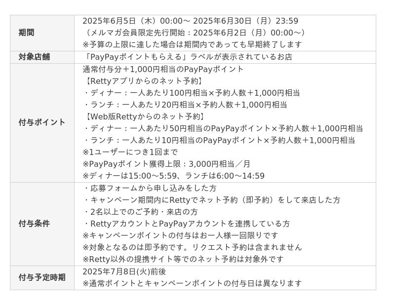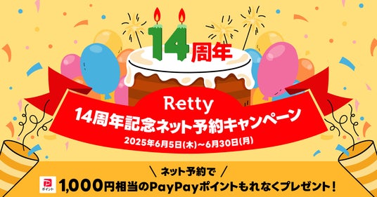 実名口コミのグルメ情報・予約サイト「Retty(レッティ)」を運営するRetty株式会社(本社:東京都港区、代表取締役 執行役員CEO:武田 和也)は、2025年6月5日(木)から6月30日(月)までの期間、「Retty 14周年記念ネット予約キャンペーン」を開催します。本キャンペーンでは、期間中にRettyを通じて対象店舗に2名以上でネット予約・来店された方に、通常付与されるPayPayポイントに加え、1,000円相当のPayPayポイントをプレゼントします。なお、ポイント受け取りにはネット予約前に専用フォームからのお申し込みが必要です。
