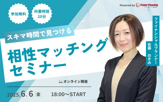 無料マネーセミナー提供サービス「アットセミナー」を運営しているパワープランニング株式会社が「6月6日(金) 12時」に「相性マッチングセミナー」というスキマ時間で自分に合ったFPを見つけられるオンラインセミナーを開催いたします。