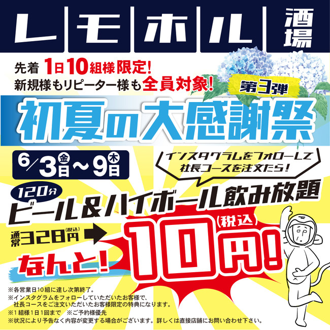 あのコスパ最強レモホル酒場がさらにコスパ最強にビール&ハイボール飲み放題が120分『10円』の初夏の大感謝祭実施致します。