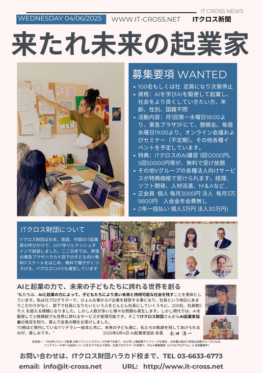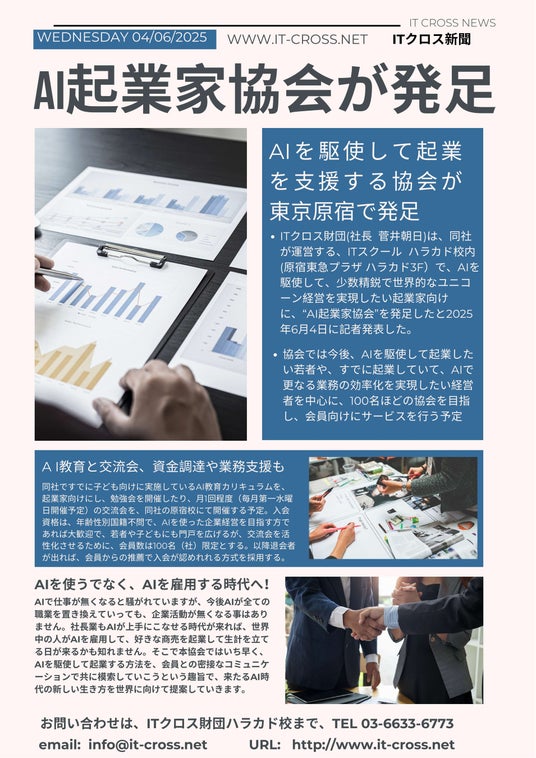 2025年6月4日、ITクロス財団(本社:東京都渋谷区、代表:菅井朝日)は、AIを駆使して起業を目指す起業家のためのコミュニティ「AI起業家協会」を原宿・ハラカド内のITスクールにて正式に発足しました。