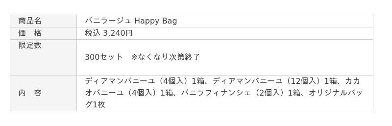 バニラージュHappy Bagを数量限定で販売します。オリジナルのブランドバッグにバニラージュ商品4点が入ったセット商品です。人気のクッキー缶も入っています!