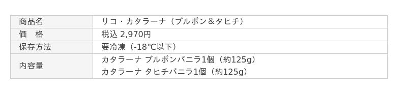 2種類のバニラを味わえるセット商品です。バニラの香りを最大限に引き出しているカタラーナ(ブルボン)と、希少で華やかな香りが特徴的なタヒチバニラを使用したカタラーナ(タヒチ)は、同じバニラでも全く香りが異なります。ぜひお召し上がりいただきご体感ください。