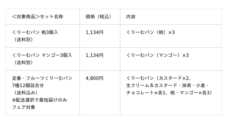 おまとめ割:期間中、期間限定フレーバーのくりーむパン「桃」もしくは「マンゴー」を含むフェア対象商品を2点以上かつ2,200円(税込)以上を同時購入で、税込商品価格から20%OFF。