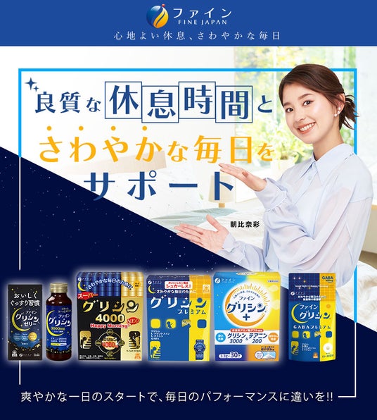 健康食品及び医薬品などを製造・販売する株式会社ファイン(本社:大阪市淀川区、代表取締役:佐々木 信綱)は、累計販売数360万個*を突破した休息ケアとして人気のサプリメント『ファイングリシン(R)+シリーズ』の広告に女優・モデルの朝比奈彩さんを起用することを発表いたします。
