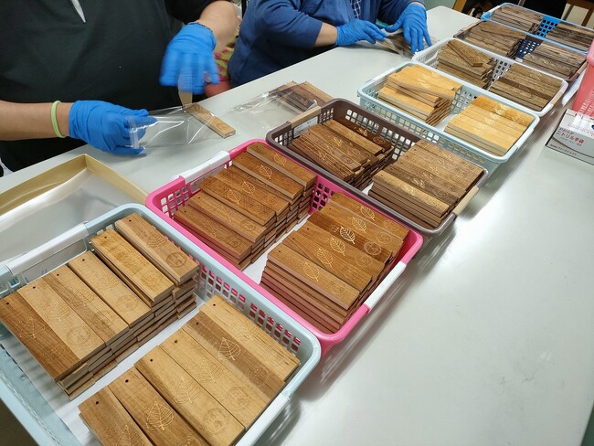 今回、ウイズで銘木のラッピング作業を受けさせていただくことになりました。ウイズは視覚障害者の就労支援施設で、日頃から視覚以外の音や手触りで確認をしながら作業をしています。7種類の銘木は一つ一つ香りと触感が違い、作業に携わる利用者さんも「まるで森の中で作業しているみたい」、「木によって重さや触感も違うね」と言いながら作業を楽しんでいます。