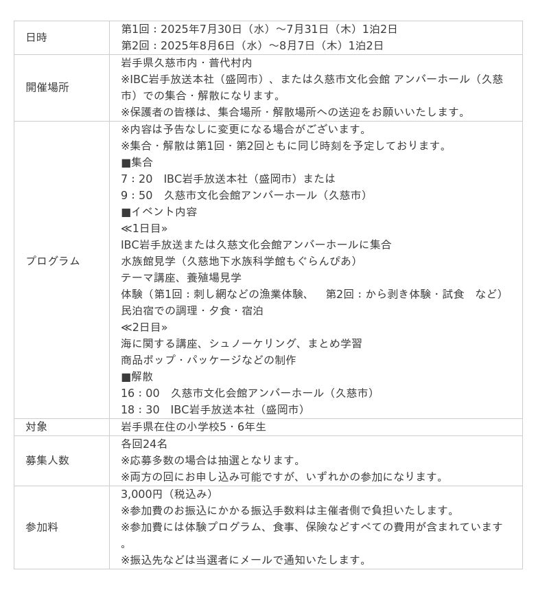 一般社団法人海と日本プロジェクトin岩手は、岩手の海の豊かさや大切さ、これからの岩手を支える海産物「サケ・マス類」と「ウニ」の現状と課題について学ぶ、小学校5・6年生向けの1泊2日の海の体験学習「いわてマリンツアー2025 in 久慈」を7月と8月に開催いたします。第1回は2025年7月30日(水)~7月31日(木)に開催のテーマが「サケ・マス類」、第2回は2025年8月6日(水)~8月7日(木)に開催のテーマが「ウニ」です。このイベントは、次世代へ豊かで美しい海を引き継ぐために、海を介して人と人とがつながる“日本財団「海と日本プロジェクト」”の一環です。