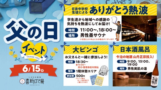 地元・日吉中学校の2年生の生徒により、地元温浴施設である「喜助の湯」の男性サウナ室にて熱波師(アウフグース)の体験を行うもので、保護者や地域の方々に対して感謝の気持ちを“熱波”で伝える新しい取り組みです。また、今治の地酒「山丹正宗」を使用した日本酒風呂、親子で参加できる大ビンゴ大会など、父の日にぴったりの特別イベントを多数ご用意しております。