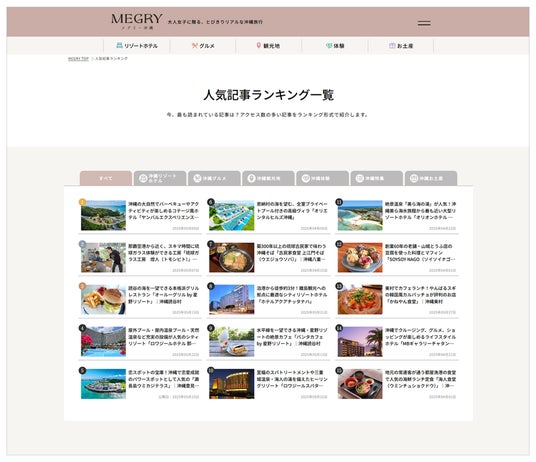 リゾーツ琉球株式会社(本社:沖縄県豊見城市、代表取締役:兼城賢成)が運営する、大人女子のための沖縄旅行メディア「MEGRY(メグリー沖縄)」は、2025年6月6日に「ホテル周辺観光」コンテンツおよび「人気記事ランキング」ページを公開しました。あわせてInstagram・TikTokなど主要SNSの公式アカウントも開設し、よりリアルで役立つ沖縄情報を多方面から発信してまいります。