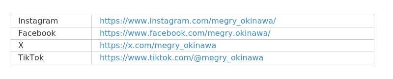 より多くの皆さまに旅の魅力をお届けするため、以下のSNSにてアカウントを開設しました。ぜひフォローして、最新の「MEGRY沖縄」をお楽しみください。