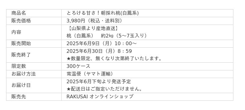 楽彩株式会社(本社:東京都足立区/代表取締役社長:大崎善保)は、昨年も大好評につき完売した『とろける甘さ!朝採れ桃(白鳳系)』の販売を、2025年6月9日(月)10:00よりオンラインストアにて開始いたします。本商品は、桃を知り尽くした“桃のプロ集団”、(株)PlayestJAPANが丹精込めて育てられた、夏にぴったりの特別な逸品です。