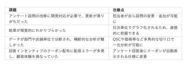 人材面では、直営店においてQSC結果と顧客の声をリンクさせた現場評価が可能となり、スタッフの貢献を適切に可視化できるようになりました。FC店舗では、アンケート結果に基づく満足度スコアでランキングを作成し配信することで、店舗間の競争意識を高めつつ、運営の質を全体的に底上げしています。