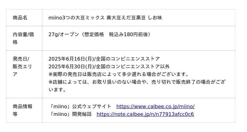 カルビー株式会社(本社:東京都千代田区、代表取締役社長兼CEO:江原 信)は、豆まるごとのおいしさを、いつでもどこでも楽しめる「miino(ミーノ)」シリーズより、3つの大豆の味わいが楽しめる新商品『miino3つの大豆ミックス 黄大豆※1えだ豆黒豆 しお味』を2025年6月16日(月)から、全国のコンビニエンスストア先行で期間限定発売します。コンビニエンスストア以外の店舗では、2025年6月30日(月)から期間限定発売します(2026年1月上旬終売予定)。