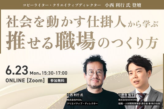 エンゲージメント向上を軸とした組織開発・人材育成コンサルティング支援を通して“推せる職場づくり”を進める株式会社NEWONE(本社:東京都港区 代表取締役:上林 周平、https://new-one.co.jp/ 以下、NEWONE)は、2025年6月23日(月)15:30~17:00にて、コピーライター・クリエイティブディレクター小西 利行氏をお招きし、これからの時代の組織・職場像や推せる職場のつくり方について、オンラインセミナーを実施いたします。