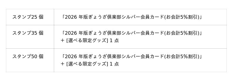 集まったスタンプの数に応じて、各種割引券やお会計が毎回5%割引になる「ぎょうざ倶楽部シルバー会員カード」をはじめ、数量限定の餃子の王将オリジナルグッズと交換できます。