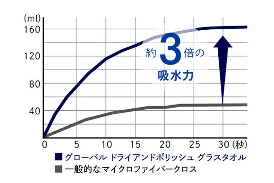 一般的なマイクロファイバークロスに比べて吸水力は約3倍(★下図グラフ 30秒時点(※))。
