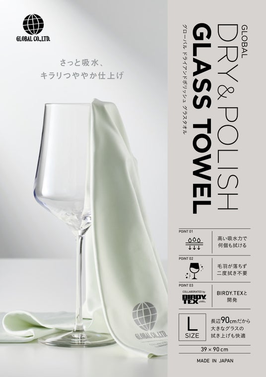 ワイン関連機器の株式会社グローバル(本社:大阪市、代表取締役:和田 修)は、グラスタオルなどバー&キッチンケアツールのブランドライン「BIRDY. TEX」 とコラボレーションし、ワイングラスの磨き上げを一度の拭き上げで可能にする高い機能性とプロの現場で快適に使えるサイズ感にこだわった、プロフェッショナルユースに応える高機能グラスタオル「グローバル DRY & POLISH グラスタオル」を2025年6月10日(火)より発売開始いたします。