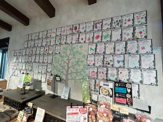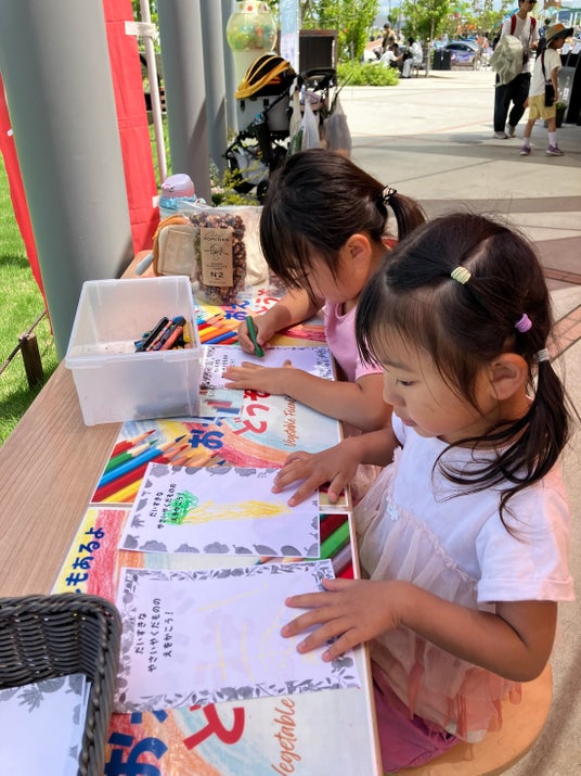 また、マルシェではカラフルな赤大根や黄ズッキーニ、形がユニークなUFOズッキーニなどの旬野菜が入った福袋を数量限定で販売し、好評を博しました。人気のソフトクリームも特別価格で提供し、長い行列ができました。定番のミルクや期間限定のトマトを使った珍しいものなど、ソフトクリームを食べた子どもたちの笑顔があふれていました。マルシェでは子どもたちが描いた野菜や果物の絵の展示も行われ、地域との絆を感じられるイベントとなりました。