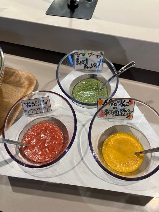 「きゅうりドレッシング」「あまりんとトマトの塩?ドレッシング」「人参とりんごの和風どれっしんぐ」の3種類!