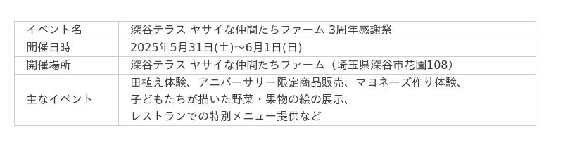 キユーピー株式会社のグループ子会社である、深谷ベジタブルコミュニケーション株式会社(本社:埼玉県深谷市、代表取締役社長:大木 賢一)は、「野菜にときめく、好きになる!みんなの笑顔を育むファーム」をコンセプトに、2022年5月29日に開業した「深谷テラス ヤサイな仲間たちファーム」の開業3周年を記念し、2025年5月31日(土)~6月1日(日)の2日間、「3周年感謝祭」を開催しました。本イベントでは、これまでのご愛顧への感謝の気持ちを込めて、アニバーサリー限定商品やレストランでの特別メニューの提供、田植え体験などを実施しました。